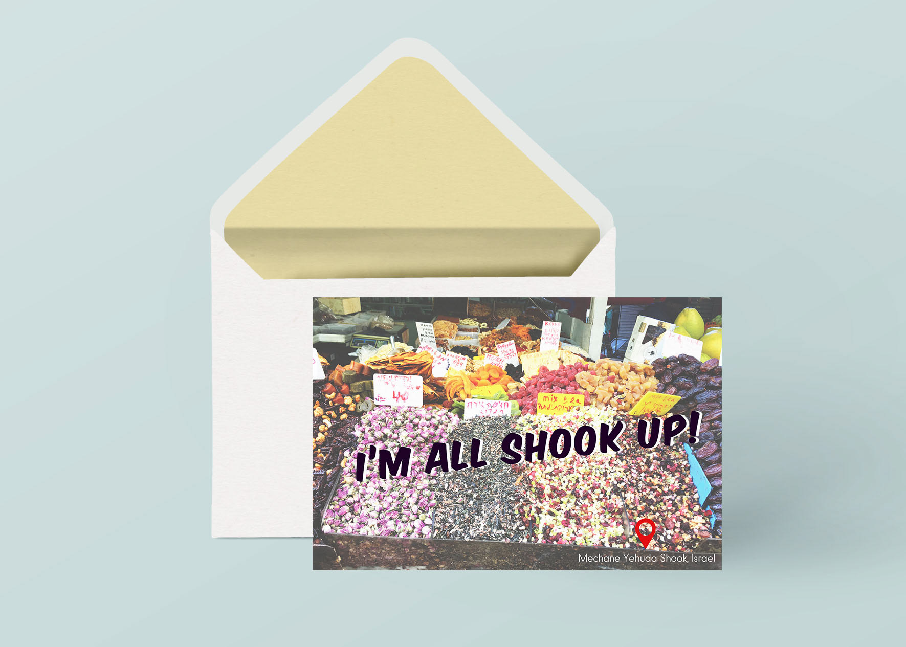 This collection of punny postcards showcase various locations in Israel using original photography. Each postcard includes a clever pun that correlates with the location pictured, while the reverse side features the layout necessary for writing a postcard.